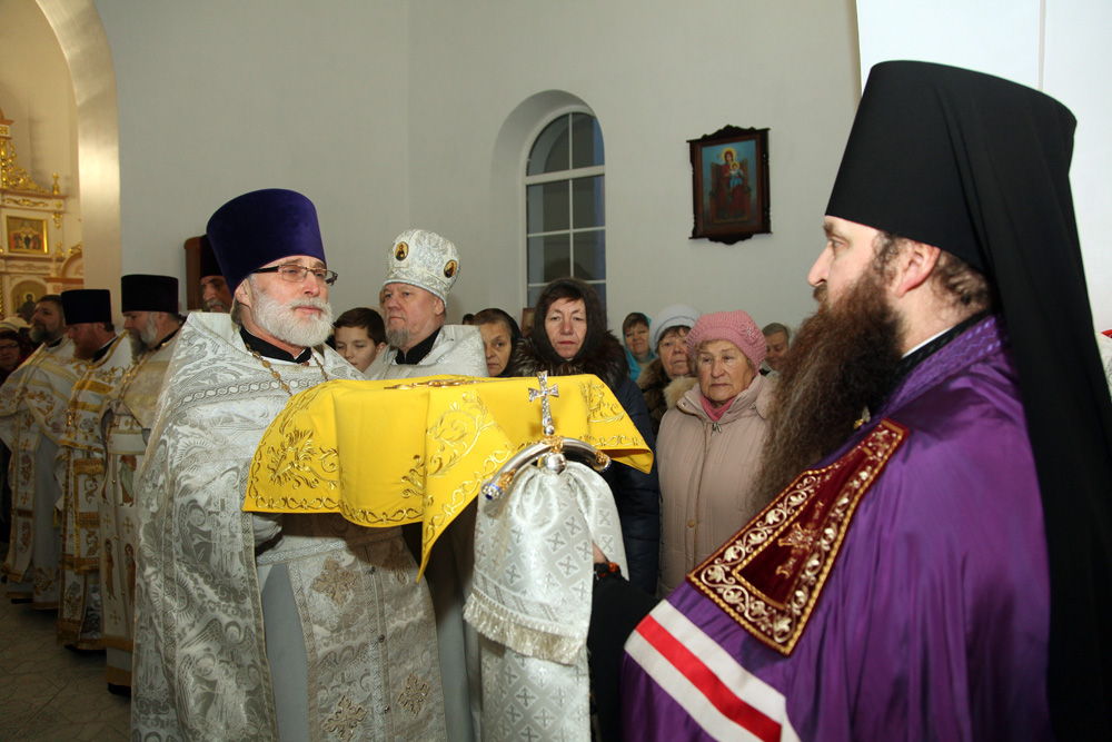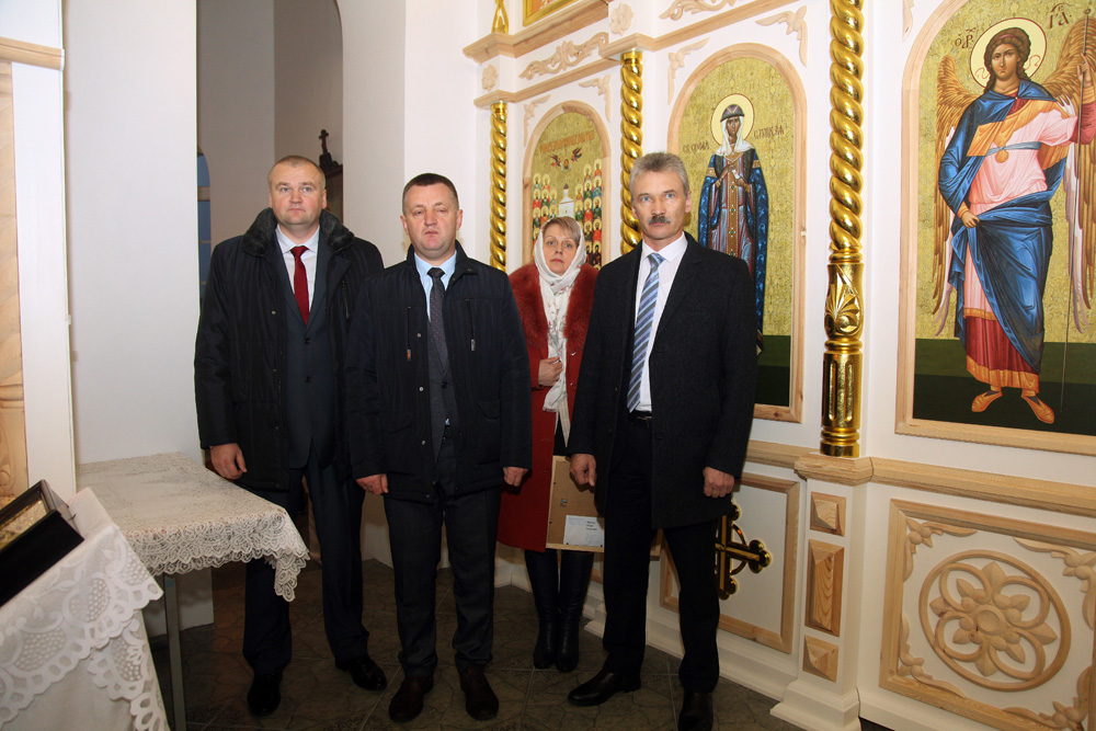 Епископ Антоний вручил председателю райисполкома Николаю Карповичу икону святого Николая Чудотворца в благодарность за активную поддержку строительства храма. Подарки новому храму — напрестольные кресты и набор для Евхаристии.