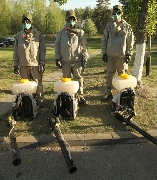 Армейцы по-военному четко, быстро и слаженно исполняют свои обязанности: буквально за час вся территория Стародорожской ЦРБ тщательно обработана специальным дезраствором.