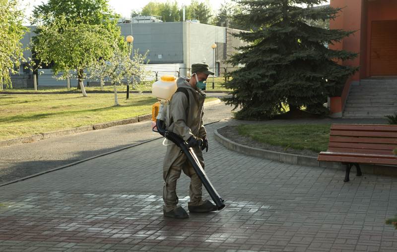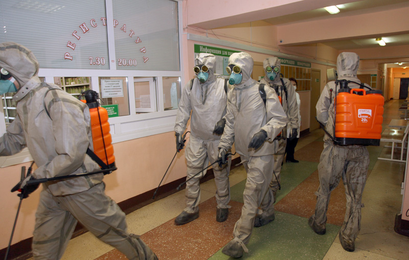 Чтобы защитить органы дыхания и кожу, используется комплект Л-1: специальный костюм и респираторы. Раствором для дезинфекции тщательно обрабатывается все вокруг и внутри больницы: перила, лестницы, стены, пол, тротуарная плитка.