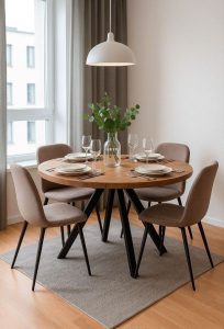 Важно, чтобы стол с раскладным механизмом гармонировал с остальной мебелью по цвету, материалу и стилю, создавая единый образ кухни.